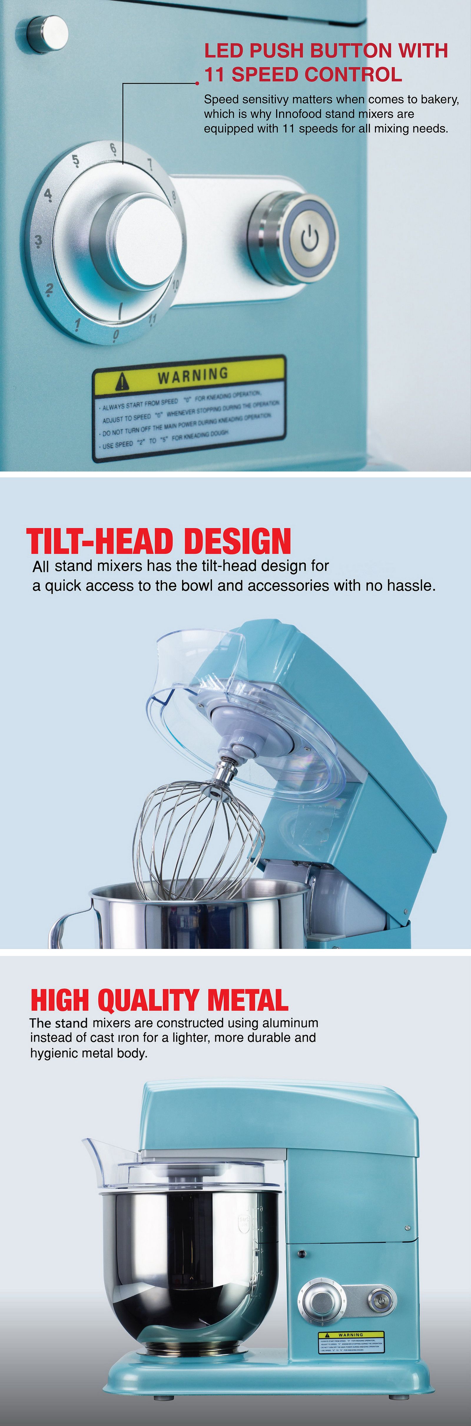 The Softer M7 stand mixer is built for performance, durability and operates at very low noise (around 40dB at low speeds). The metal body is designed to provide stability and sturdy mixing process even at its highest speed. (No awkward wobbling, unless the table itself wobbles!). The 500W DC motor offers consistent torque for the best mixing experience. Basically its a commercial stand mixer now made perfect for home use (suitable for big families too). With dough kneading capacity of up to 2kg and amazing 11 speeds selection, M7 is truly a stand mixer that allows you to expand your culinary creativity.